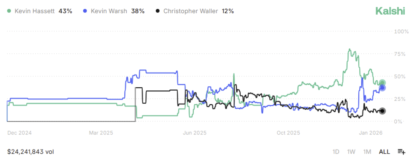 Shifting gears from markets to the macro lens, let’s start with what is effectively guaranteed at the Federal Reserve in 2026: a new Fed Chair. Jerome Powell’s final term as current Federal Reserve Chair will end in May 2026, and speculation around his successor has already become a focal point in financial media. President Trump is almost certain to nominate someone who broadly shares his views on the current interest rate environment and the state of the U.S. economy.  The emerging list includes Fed Governors Chris Waller and Michelle Bowman, Former Fed Governor Kevin Warsh, and National Economic Council Director Kevin Hassett. At the time of writing, Kalshi’s prediction market assigns a 43% probability to Hassett becoming the nominee, making him the clear front runner based on current wagers.